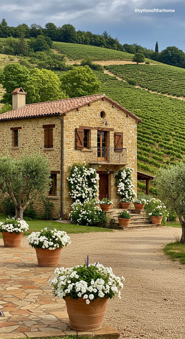 Nestled amidst the rolling green hills of a vineyard, this stone French home is a romantic haven. Its facade is dramatically flanked by two magnificent climbing bushes of pure white roses, their blooms cascading around the entrance. The warm stone construction and terracotta tile roof feel perfectly at home in this fertile landscape. Terracotta pots filled with more white flowers line the stone steps and patio, creating a cohesive and elegant floral theme. The driveway, composed of gravel and flagstone, leads the eye through this beautiful setting towards the promise of fine wine and serene living.