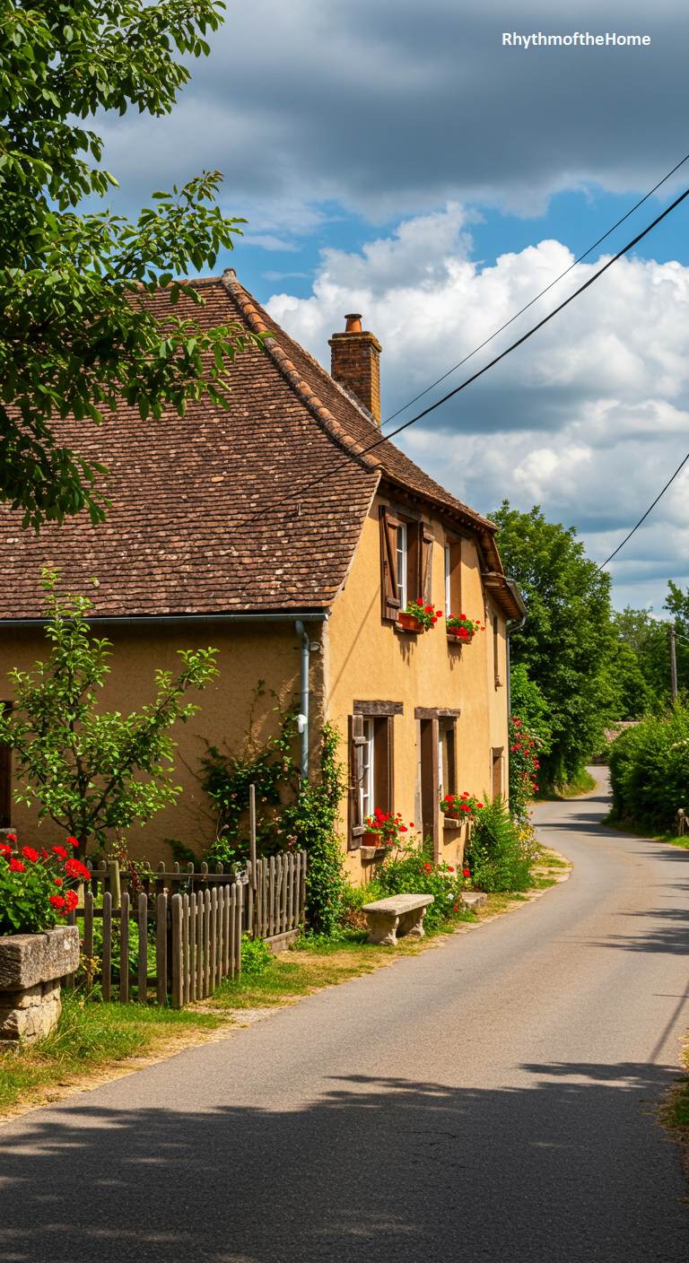 This modest French home sits peacefully on the edge of a quiet country road, embodying the simple charm of village life. Its ochre-colored stucco walls are warm and inviting, punctuated by brown wooden shutters and cheerful red geraniums in the window boxes. A rustic wooden fence and a low stone planter create a small but lovely garden space at the front. A stone bench offers a place to rest and watch the world go by. The leafy branches of a large tree cast shifting shadows on the road, adding to the tranquil, slow-paced atmosphere of this delightful rural scene.