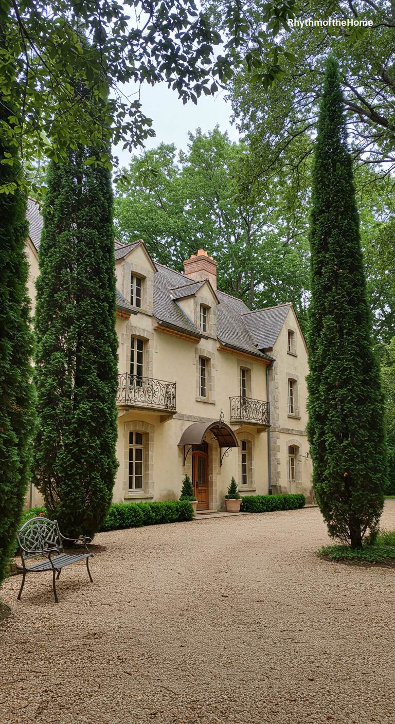 This beautiful manorial French home is framed perfectly by two tall, slender cypress trees, creating an air of formal Italianate elegance. The pale yellow facade is refined and well-proportioned, featuring classic windows with delicate wrought-iron balconies. A curved, transparent awning over the front door adds a touch of modern grace without detracting from the historic character. The expansive gravel courtyard is clean and simple, emphasizing the architectural beauty of the house itself. A single wrought-iron bench sits quietly to the side, inviting a moment of contemplation in this serene and sophisticated setting.