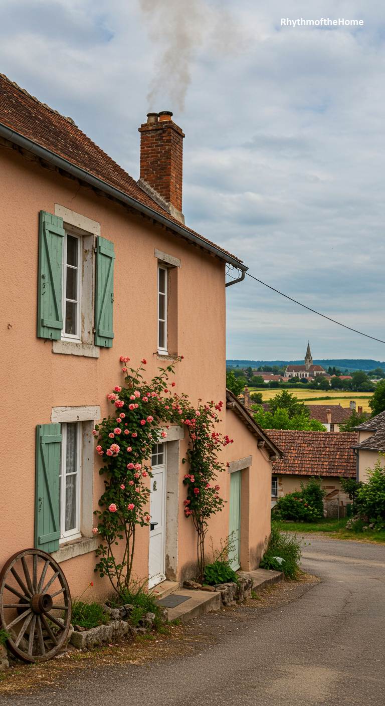 This charming French home tells a story of simple, beautiful village life. Its salmon-pink stucco walls provide a warm and cheerful backdrop for the vibrant pink climbing roses that frame the front door. The weathered, pale green shutters add a touch of rustic, time-worn character. An old wooden wagon wheel leans against the house, a nostalgic nod to a bygone agricultural era. From this vantage point, the view extends over the terracotta rooftops of the village to a church steeple in the distance, firmly placing this lovely home within its close-knit community.