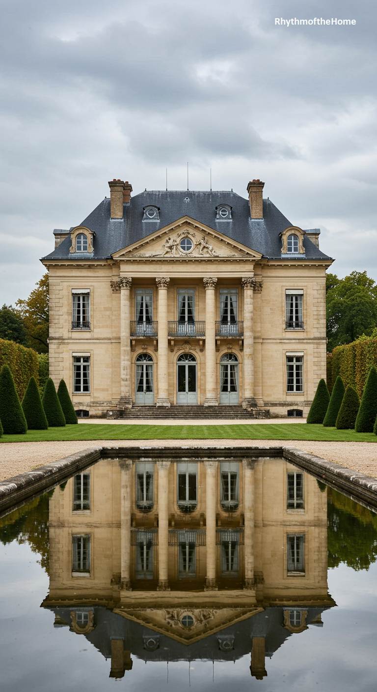 This grand French home is a masterful example of Neoclassical architecture, its elegance doubled by a perfect reflection in the still water of a formal reflecting pool. The symmetrical facade of light-colored stone is dominated by a central portico with four towering columns, supporting a triangular pediment. Large, evenly spaced windows and a stately balcony further enhance its balanced and harmonious design. Manicured, cone-shaped hedges line the gravel path, leading the eye directly to this stunning vision of order, grandeur, and perfect, watery symmetry under a dramatic cloudy sky.