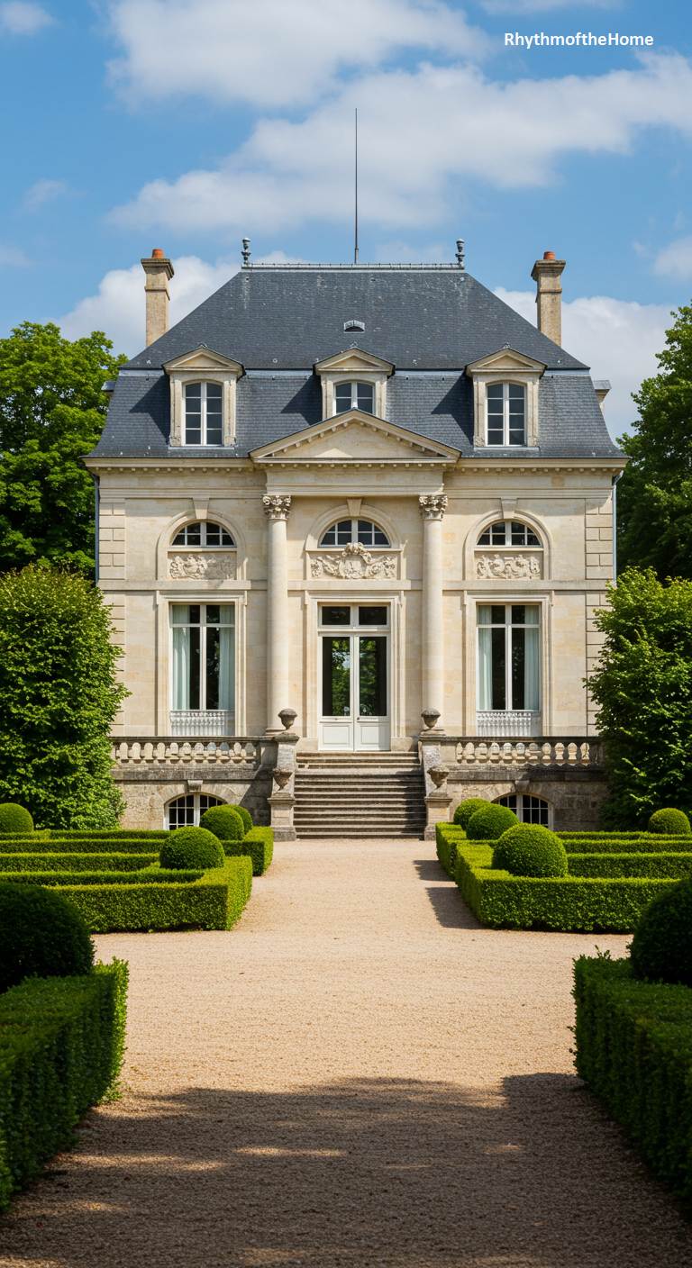 This beautiful French home presents a vision of perfect, harmonious design, where architecture and landscape are in complete accord. The pale stone facade, featuring a central columned entrance and a classic slate roof with dormer windows, is a picture of Neoclassical balance. A wide gravel path leads the eye directly to the elevated entrance. The foreground is a stunning formal garden, with intricate, low-lying boxwood hedges creating geometric patterns on either side of the path. The play of light and shadow from the nearby trees adds depth and life to this serene and impeccably designed estate.