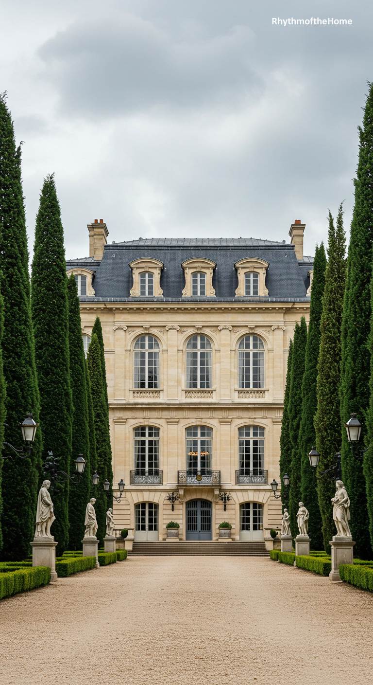 The approach to this stately French home is as magnificent as the building itself. A long, wide gravel drive is flanked by an imposing allée of tall, slender cypress trees and classical statues, creating a dramatic and formal procession towards the entrance. The house at the end is a grand, multi-story structure of pale stone, with a dark mansard roof and rows of elegant windows. The sheer scale and rigid symmetry of the landscaping, combined with the formidable architecture, speak of immense wealth, power, and a taste for breathtaking, classical grandeur.