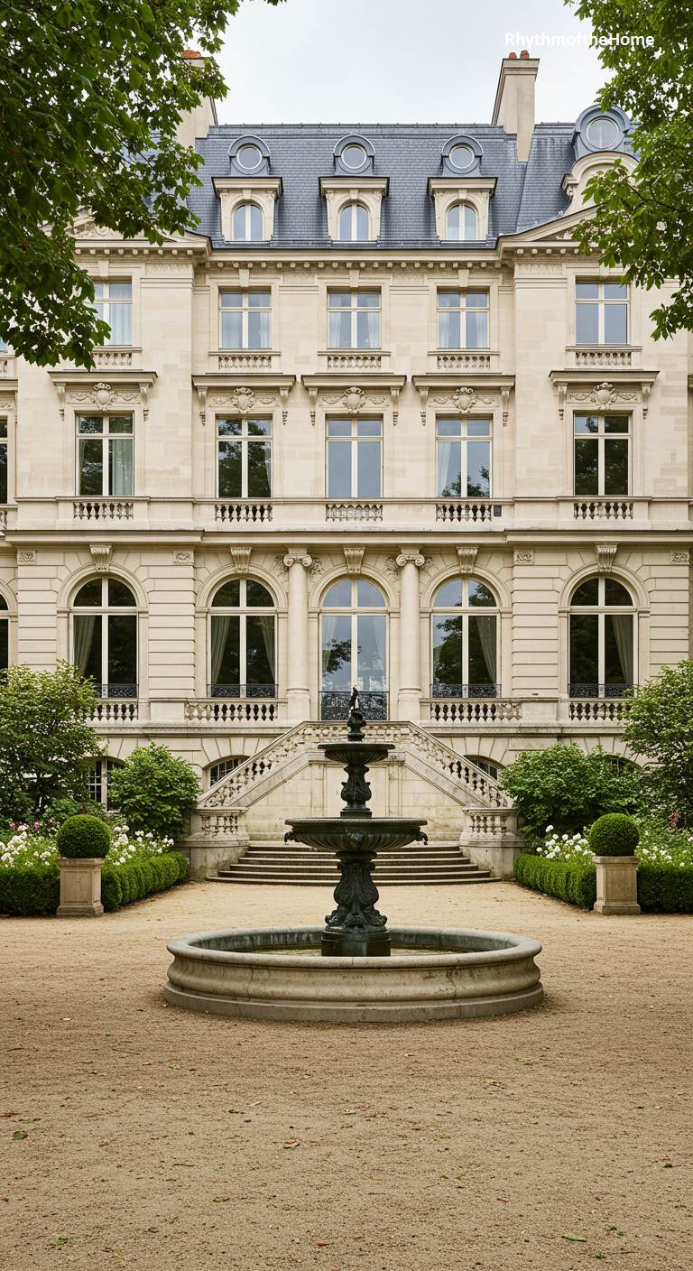 This grand Parisian-style French home, or “hôtel particulier,” is the epitome of urban elegance. Framed by the leafy branches of mature trees, its multi-story facade of pristine light stone features rows of large, arched windows and delicate wrought-iron railings. A magnificent tiered water fountain, dark and ornate, serves as the centerpiece of the gravel courtyard, adding a sense of life and movement to the formal setting. A grand staircase leads up to the main entrance, creating a sense of occasion. This is a residence of incredible sophistication and quiet, private luxury in the heart of the city.