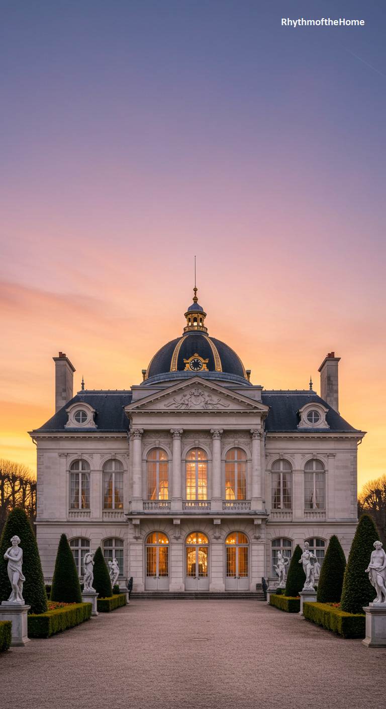 As the sun sets in a blaze of orange and purple, this palatial French home is transformed into a scene of breathtaking drama and beauty. The light catches the golden accents on the central dome and clock, making them shine. The grand, light-stone facade, with its classical columns and arched windows, is bathed in a warm, ethereal glow from the lights within and the sky above. An avenue of conical topiary and classical statues leads the eye towards the entrance, reinforcing the building’s immense scale and formal, Versailles-like splendor. This is a moment of pure, opulent magic.