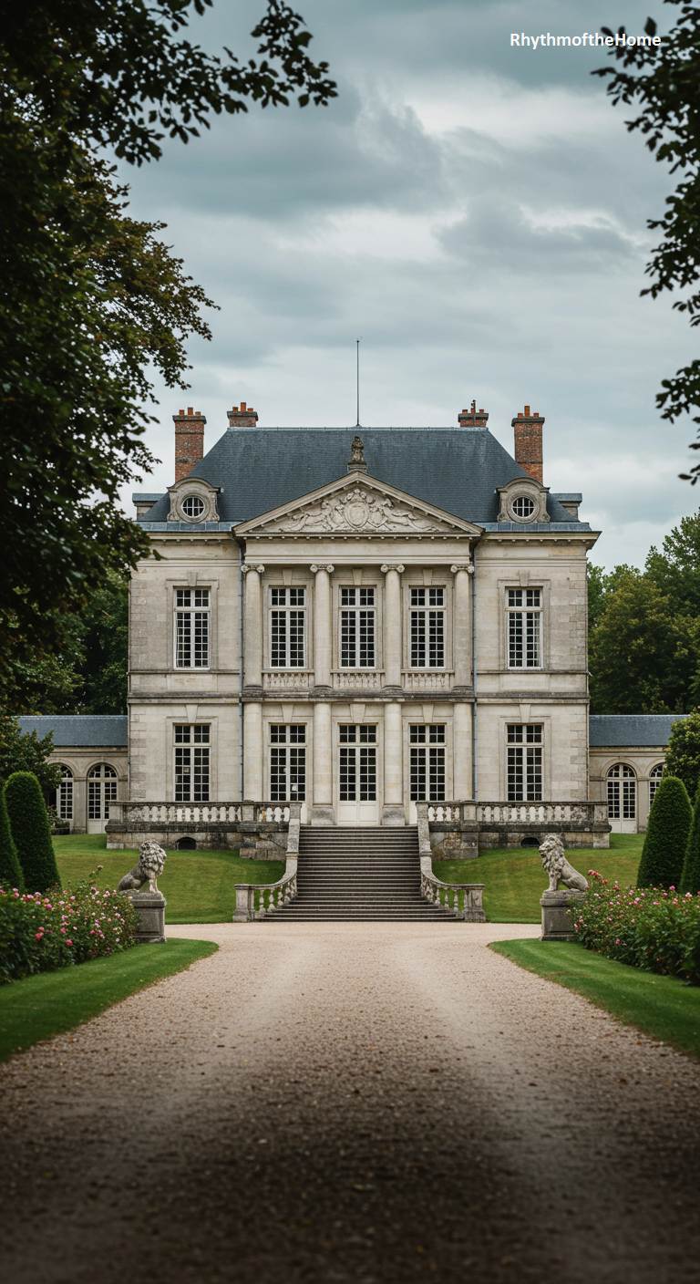 Viewed through a natural frame of lush green trees, this grand French home appears as a timeless, idyllic vision. The long gravel driveway leads the eye past statues of regal lions and manicured lawns toward the symmetrical, light-stone facade. The architecture is pure Neoclassicism, with a central portico of tall columns, a triangular pediment, and two balanced wings extending on either side. The muted, almost cinematic color palette of the cloudy day enhances the sense of stately permanence and quiet, aristocratic history that this magnificent country estate embodies.