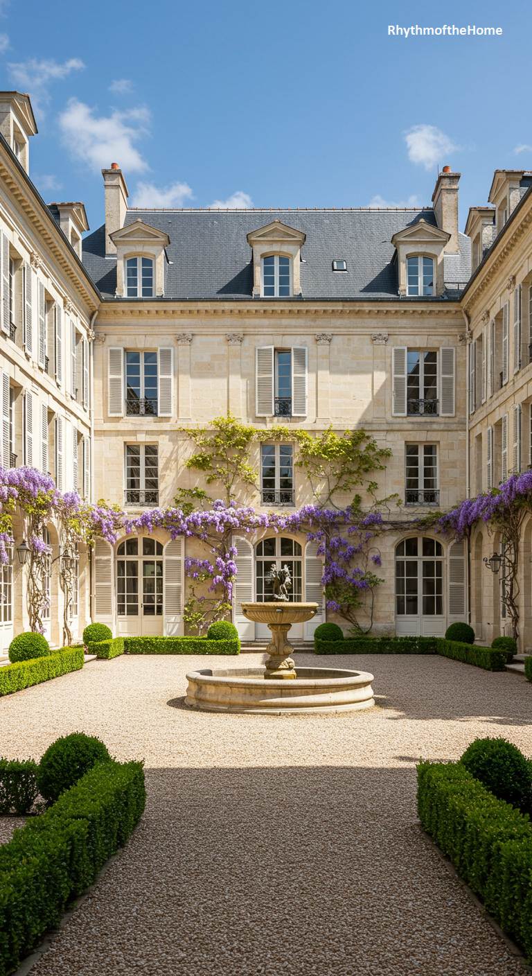 This elegant French home is designed around a sunlit and welcoming courtyard, offering a sense of private splendor. The U-shaped building, with its pale stone walls and classic slate roof, is adorned with beautiful purple wisteria vines that climb and drape across the facade, adding a burst of seasonal color. A simple but elegant stone fountain sits at the center of the gravel courtyard, its circular form echoed by the manicured boxwood hedges. The overall effect is one of harmonious design, where refined architecture and beautiful horticulture combine to create a perfect, tranquil retreat.