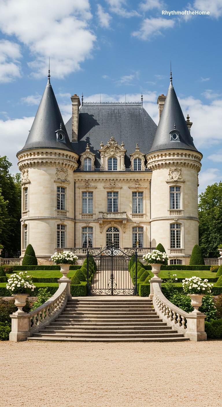 Bathed in the brilliant light of a summer day, this majestic French home stands as a testament to classical grandeur. Its perfectly symmetrical facade, built from pristine, light-colored stone, is flanked by two imposing conical towers. A steep, dark slate roof adds a dramatic contrast, while ornate carvings and a delicate wrought-iron balcony above the entrance highlight its aristocratic heritage. A grand stone staircase sweeps down to a meticulously manicured lawn and a wide gravel forecourt, leading the eye to an elegant wrought-iron gate. This is not merely a house; it is a declaration of elegance and history.
