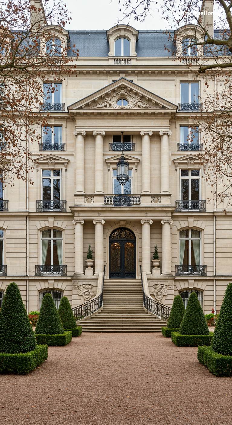 This imposing French home is a masterpiece of Beaux-Arts architecture, exuding the power and prestige of high Parisian society. The multi-story facade is a complex and beautiful composition of carved stone, featuring a grand central entrance with a columned portico. An ornate lantern hangs above the door, and delicate wrought-iron balconies grace the windows on the upper floors. The formal approach, with its gravel path flanked by perfectly sculpted conical evergreens, creates a sense of ceremony and importance. This is a residence built to impress, a symbol of wealth and exquisite taste.