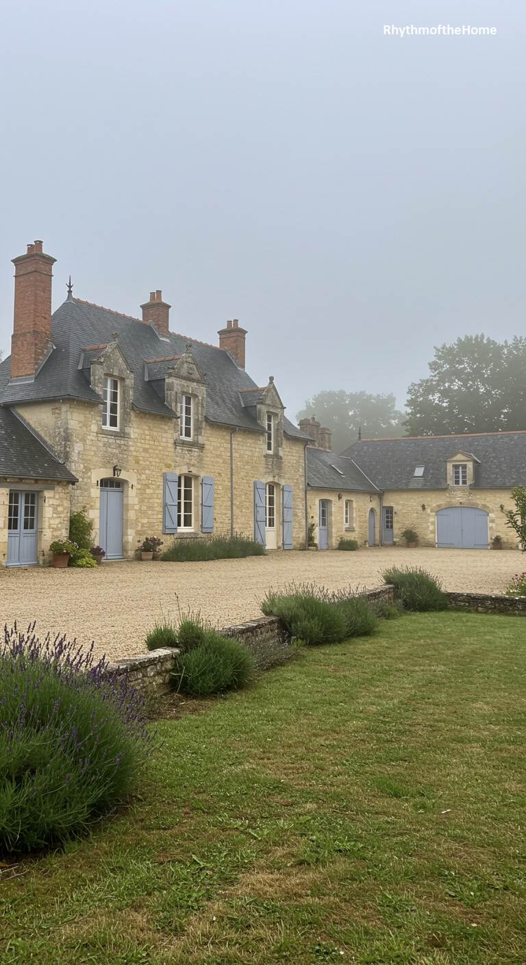A gentle morning fog envelops this sprawling French country home, lending it an air of quiet mystery and timelessness. The long, low-slung building, made of classic honey-colored stone, stretches across the landscape. Its powder-blue shutters are closed against the cool air, and the dark slate roofs recede into the mist. A gravel courtyard in the foreground gives way to a lush green lawn, where rows of lavender stand in soft, muted tones. The scene is incredibly peaceful, capturing a moment of hushed stillness before the day truly begins in the French countryside.