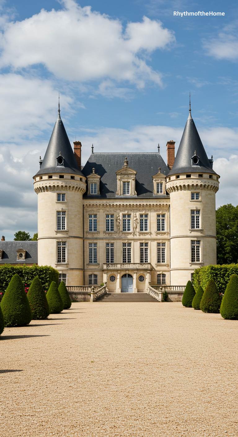 This magnificent French home is a vision of perfect, fairytale symmetry. The central body of the château, with its light-colored stone, steep slate roof, and ornate dormer windows, is flanked by two identical conical towers, creating a balanced and harmonious silhouette. The wide gravel forecourt is bordered by precisely clipped conical hedges, mirroring the shape of the towers and reinforcing the formal, geometric design of the estate. Under a sky of blue and white clouds, this château stands as a proud and pristine example of classic French aristocratic architecture.