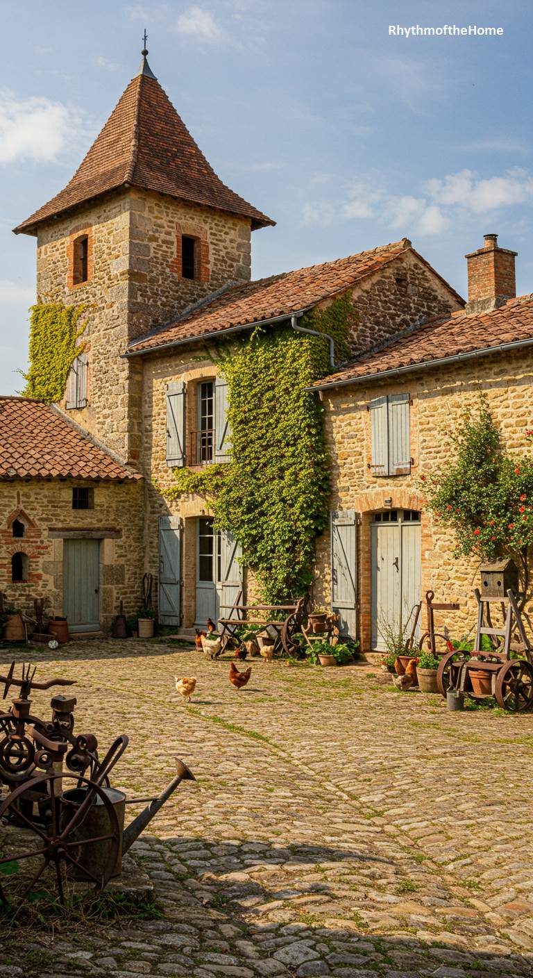 This charming French home is the heart of a bustling, rustic farmstead. The courtyard, paved with ancient, uneven cobblestones, is filled with the character of rural life, from antique farm implements and a watering can to chickens pecking in the sun. The buildings are a beautiful collection of weathered stone and terracotta roofs, with ivy climbing the walls of the main house and its distinctive square tower. The pale blue shutters add a classic touch of color to the warm stone. This is not a manicured estate but a living, breathing home, rich with history and authentic country charm.