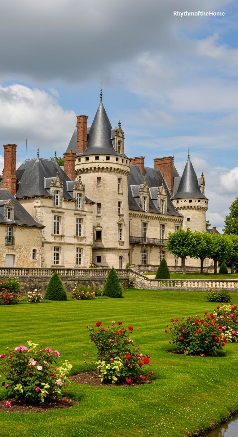 This enchanting French home looks like a castle straight out of a storybook, set against a backdrop of lush green lawns and a dramatic sky. Its complex architecture features multiple towers with conical slate roofs, crenellations, and varied window styles, all constructed from light-colored stone. The meticulously striped lawn, dotted with rose bushes in full bloom and conical topiary, speaks of dedicated care and a love for formal gardening. A low balustrade separates the manicured grounds from the main structure, creating a scene of romantic, almost magical, aristocratic beauty.