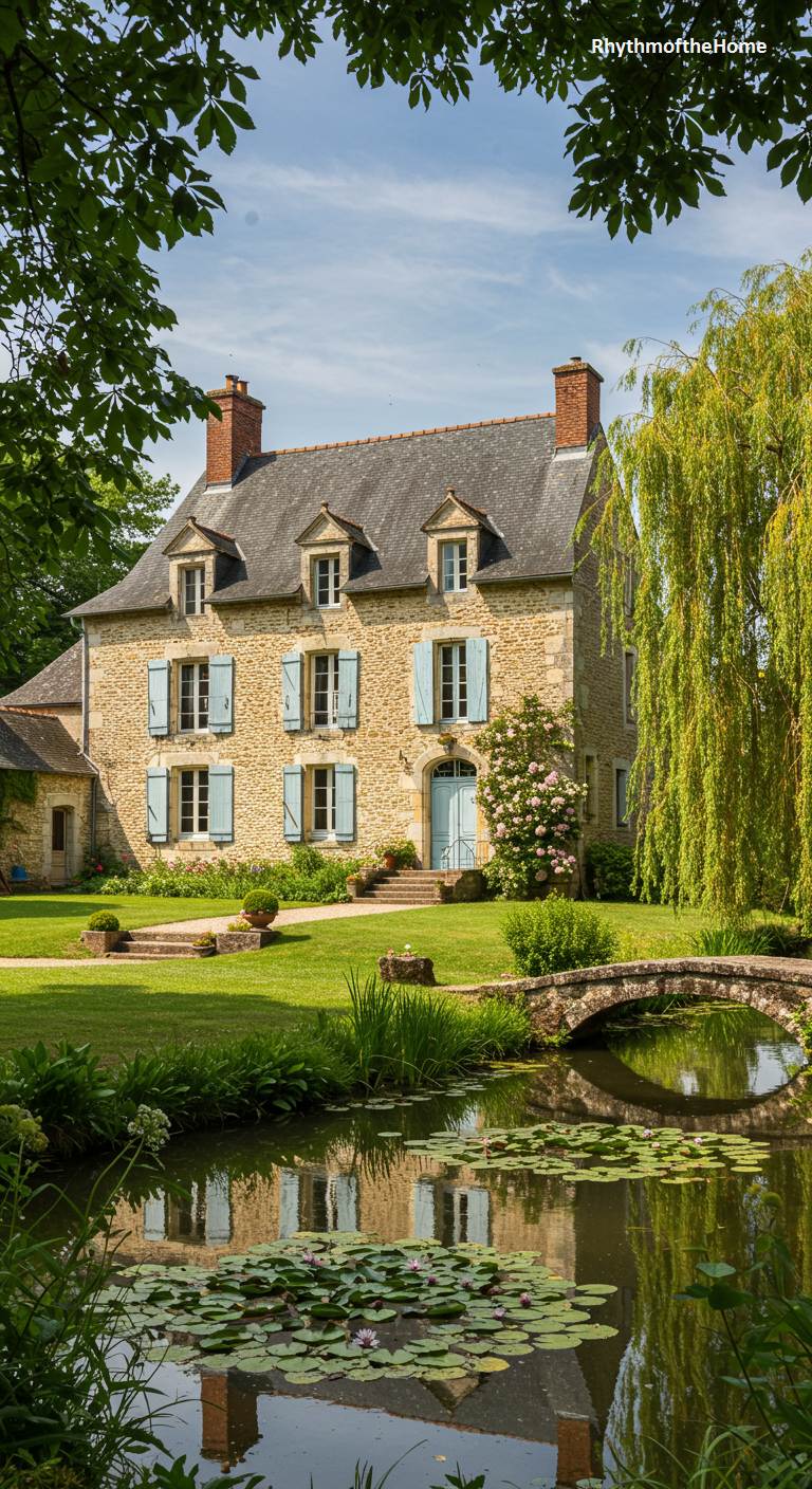 This idyllic stone French home is the epitome of tranquil, romantic country living. Nestled beside a serene pond dotted with water lilies, its reflection shimmers on the water’s surface. The house itself is a classic beauty, with multi-paned windows, soft blue shutters, and a climbing rose bush gracing the facade. A charming stone arch bridge crosses a small stream that feeds the pond, connecting the main lawn to the home. A graceful weeping willow tree drapes its branches towards the water, completing this picture-perfect scene of peaceful, natural elegance.