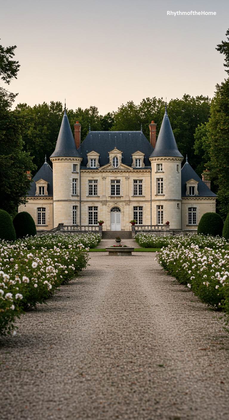 The approach to this stunning French château is an avenue of pure romance. A long gravel driveway is flanked by dense, burgeoning rows of white roses, creating a breathtaking floral welcome. The château itself, framed by dark green woods, is a classic and elegant structure. Its symmetrical facade of pale stone is topped by a steep slate roof and flanked by two identical conical towers. As dusk begins to settle, the scene takes on a soft, dreamy quality, highlighting the timeless beauty and fairytale charm of this exquisite country estate.