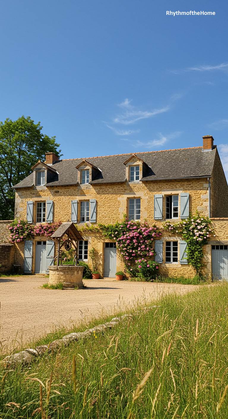 This cheerful French home is a celebration of country life and blooming flowers. The sun-drenched facade of golden stone is beautifully adorned with climbing pink roses that sprawl across the walls, adding vibrant color and fragrance. An old stone well stands prominently in the gravel courtyard, a charming and historic focal point. Pale blue shutters and doors provide the classic French countryside color contrast. With tall summer grasses in the foreground and a brilliant blue sky overhead, this home represents a perfect, sun-filled day in a rural paradise.
