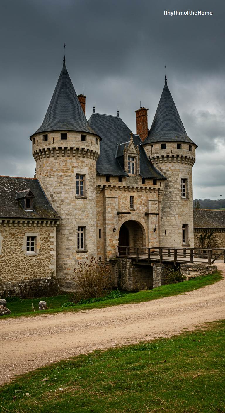 This formidable French home speaks of a deep and dramatic history, appearing more like a medieval fortress than a country estate. Its thick stone walls, round towers with crenellations, and narrow windows suggest a past built for defense. A wooden bridge crosses what may have once been a moat to an arched gateway, the main point of entry. Set against a dark, stormy sky, the château has an imposing and slightly melancholic presence. The surrounding green landscape, with its simple dirt road, only serves to highlight the rugged, enduring strength of this ancient stone structure.