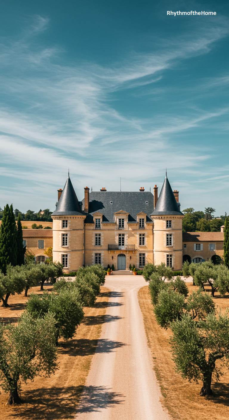 This quintessential French home is perfectly situated in a sun-drenched landscape of southern France or Provence. A long, straight dirt road, lined with rows of gnarled olive trees, leads the eye directly to the elegant château. The building’s warm, yellow-toned stone facade and conical towers glow under the vast, expressive sky. The combination of the classic, noble architecture with the agricultural beauty of the olive grove creates a scene that is both grand and deeply connected to the land, evoking a sense of peaceful, sun-baked prosperity.