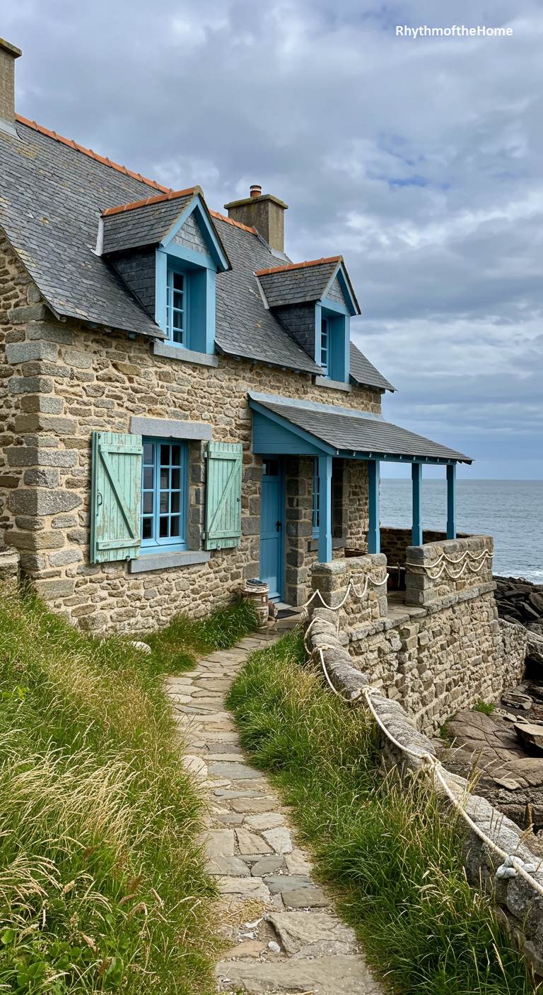 Perched on a rugged cliffside, this stone French home gazes out at the vast, moody sea. Its solid, weathered stone walls speak of resilience against the coastal elements, while the vibrant sky-blue paint on its window frames, shutters, and covered porch adds a cheerful, nautical touch. A winding flagstone path, bordered by wild, windswept grasses, leads to the front door. A thick rope serves as a rustic railing along the stone retaining wall, enhancing the maritime theme. This home offers a breathtaking, intimate connection to the wild beauty of the Brittany coastline.