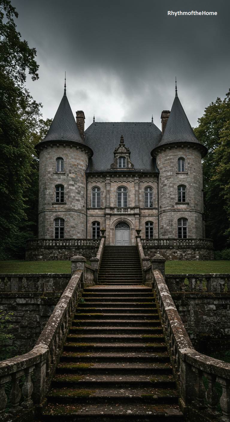 Under a heavy, brooding sky, this stone French home takes on a wonderfully gothic and mysterious character. The long, moss-covered stone staircase seems to ascend from the dark woods into another time, leading to the weathered facade. The château is flanked by two round towers and features intricate stone carvings above the windows and doorway. The entire scene is steeped in an atmosphere of ancient history and romantic melancholy. It feels like the setting for a classic novel, a place of secrets and enduring, somber beauty, waiting for a story to unfold.