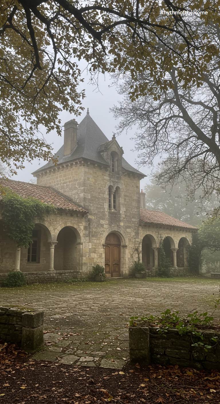 This ancient French home, with its stone arches and cloistered walkway, evokes the serene and contemplative atmosphere of a monastery. A thick, damp fog hangs in the air, blurring the edges of the surrounding trees and adding a layer of profound mystery to the scene. The stone walls are weathered and patched with moss, and the terracotta tile roof adds a touch of warm color to the muted palette. The large, paved courtyard is scattered with fallen leaves, suggesting the passage of seasons and time in this quiet, historic, and deeply atmospheric place.