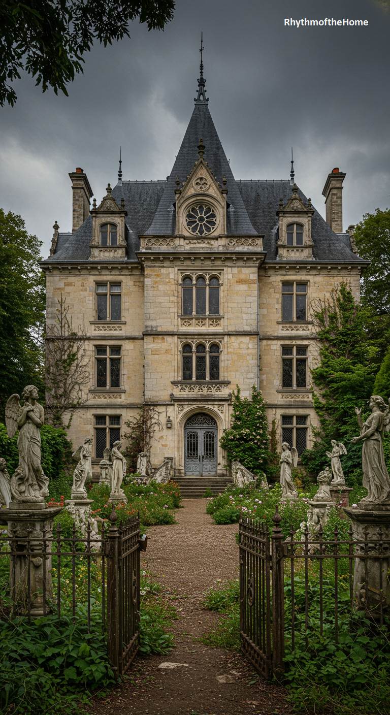 This French home is a unique and hauntingly beautiful example of Gothic Revival architecture. Its tall, intricate facade of light-colored stone features a magnificent rose window and pointed arches, evoking the grandeur of a cathedral. What makes it truly extraordinary is the garden, which feels more like a celestial cemetery. A host of weathered stone angel statues stands among the overgrown flowers and weeds, their arms outstretched as if guarding the path to the front door. Under a dark, cloudy sky, the atmosphere is one of melancholy, romance, and divine, forgotten beauty.
