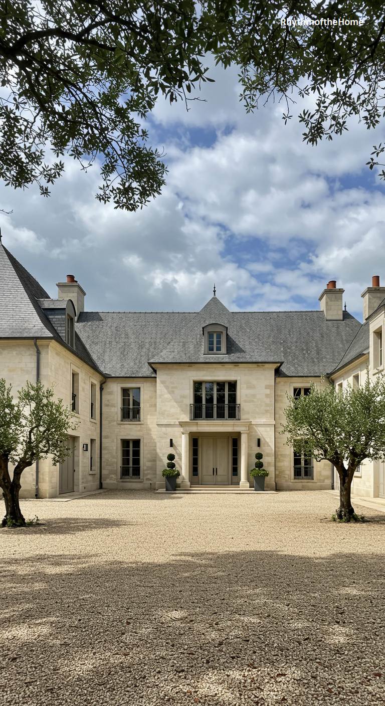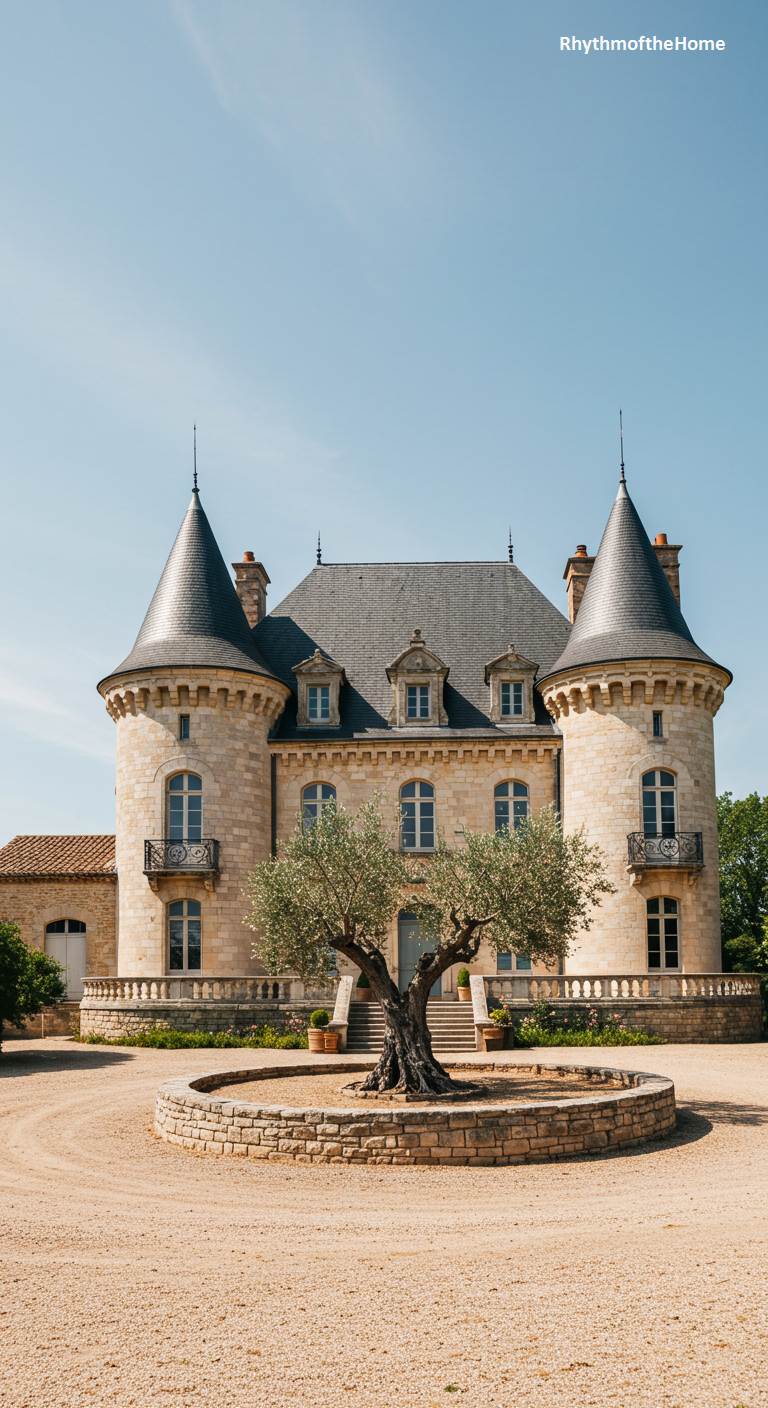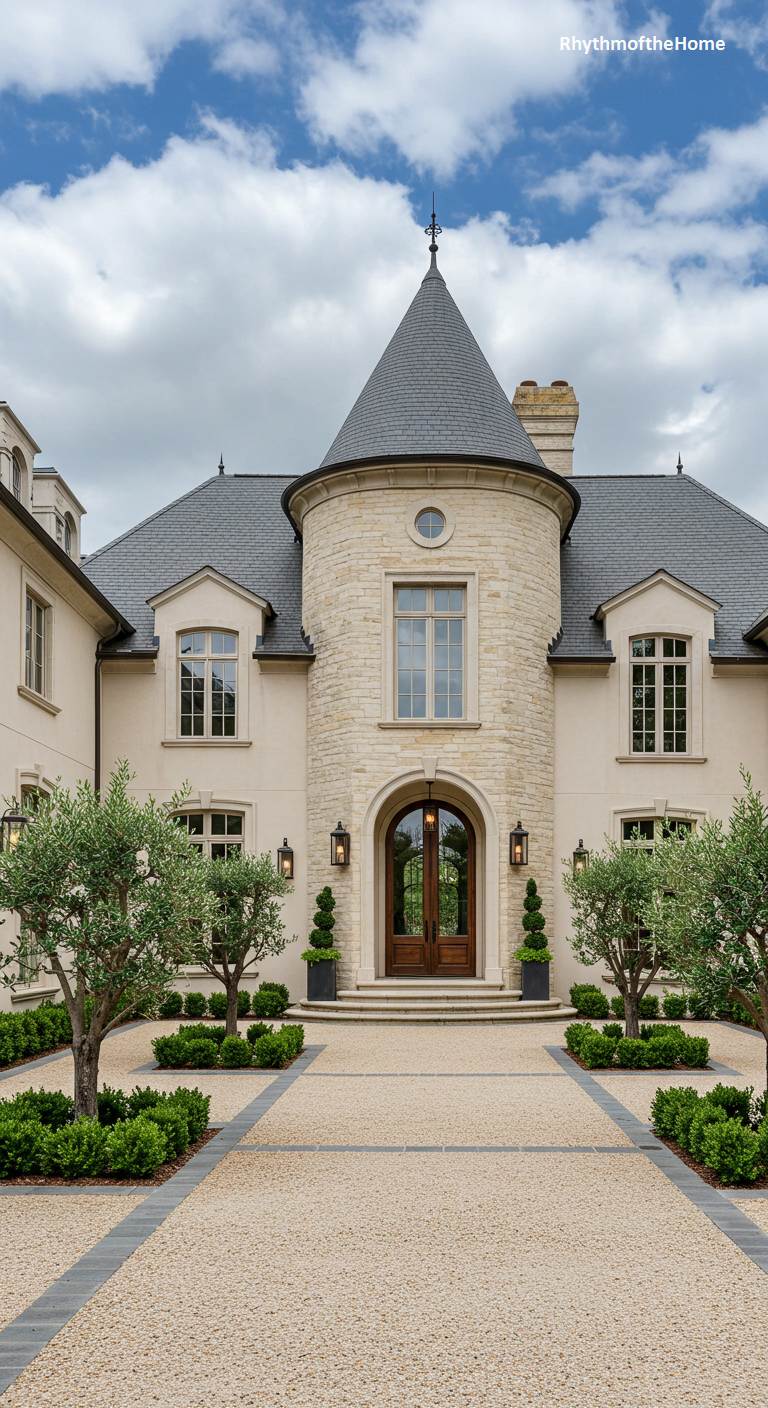 This grand French home combines the romance of a turret with the elegance of formal design. The entrance is located within a prominent round tower made of beautiful, light-colored stone, giving the house a castle-like feel. The main body of the house is finished in a smooth, complementary stucco. Young olive trees and manicured topiaries are artfully placed within the gravel courtyard, which features neat stone borders. It’s a sophisticated blend of classic French architectural elements and meticulously planned landscaping, creating a look of refined and welcoming grandeur.
