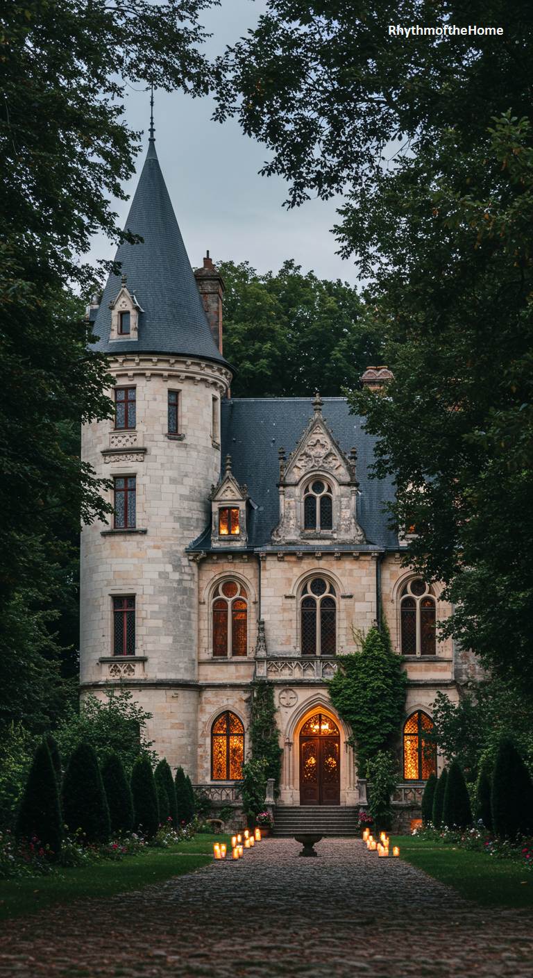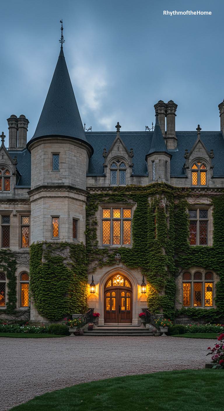 As evening descends, this Gothic-inspired French home becomes a place of enchantment and mystery. The warm, inviting light spilling from its leaded glass windows creates a stark contrast with the cool, dusky sky. The home’s stone walls, complete with a commanding conical turret and numerous chimneys, are almost entirely consumed by a thick blanket of dark green ivy. This living cloak softens the formidable architecture, which features pointed arches and intricate stone mullions. The soft glow from the entryway lanterns beckons visitors down the gravel drive, promising refuge and old-world splendor within its walls.