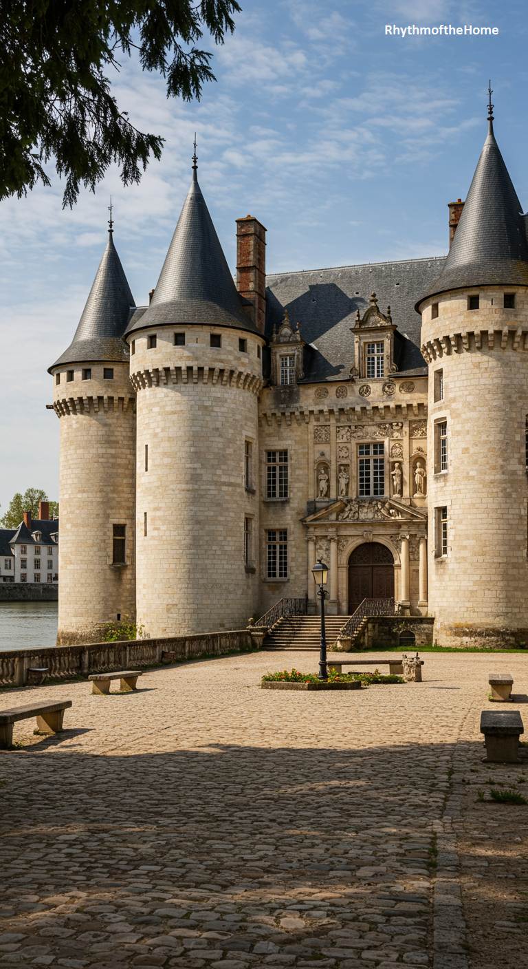 This imposing French home stands proudly on the banks of a wide river, its stone foundations meeting the water’s edge. Its architecture is that of a powerful medieval fortress, complete with three formidable round towers with crenellated tops and a strong central keep. The bright sun of a clear day highlights the texture of the light-colored stone, casting sharp shadows and revealing its historic details. A wide, paved esplanade with stone benches offers a place to sit and admire the river, grounding this historic military structure in a more peaceful, modern context.