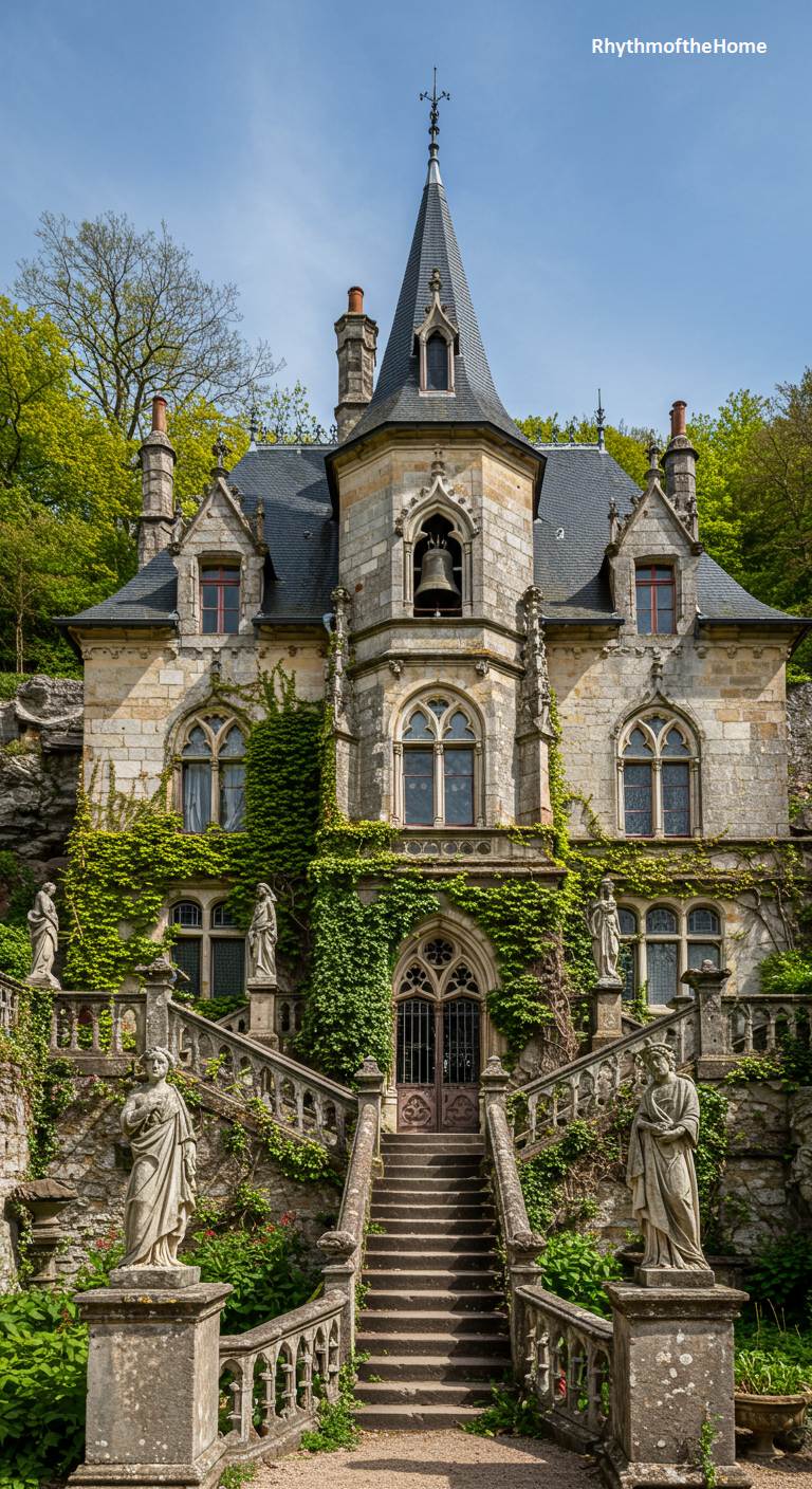 Carved into a rocky, ivy-clad hillside, this French home is a spectacular example of Gothic Revival fantasy. A grand stone staircase, flanked by statues on pedestals, ascends dramatically toward the ornate, gated entrance. The facade is a breathtaking display of gothic elements: pointed arches, intricate stonework, climbing ivy, and a central tower complete with a large bell. The entire structure seems to grow organically from the surrounding rock and foliage, creating a powerful and romantic fusion of man-made artistry and the wildness of nature. This is a home for dreamers and lovers of high drama.