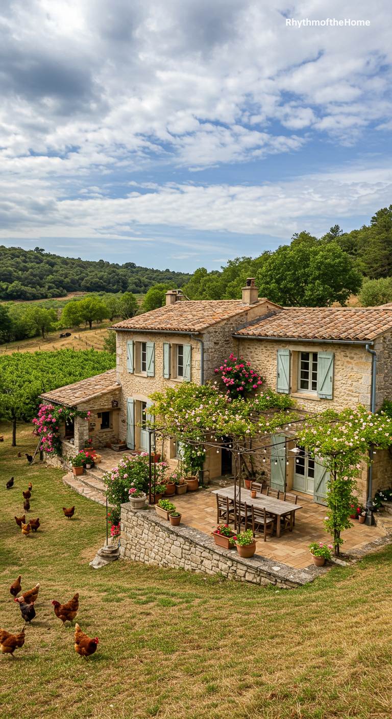 This idyllic French home is the heart of a sun-drenched Provençal dreamscape. Constructed from warm, honey-colored stone and capped with a terracotta tile roof, it exudes rustic authenticity. A charming pergola, draped in flowering vines, creates a shaded outdoor dining area on the stone terrace, perfect for enjoying the picturesque landscape. A flock of chickens roams freely on the lawn below, adding life and bucolic charm to the scene. In the background, rolling green hills and vineyards stretch towards the horizon under a vast, cloud-dappled sky, completing this vision of country living.