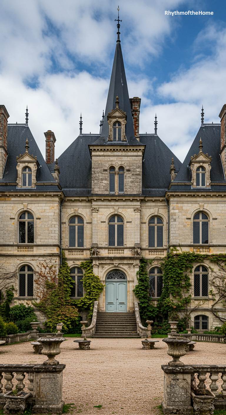 This stately French home possesses a touch of playful whimsy. The grand, weathered stone facade, with its tall arched windows and intricate central spire, has a formal, slightly gothic feel. However, the cheerful powder-blue front door provides a surprising and delightful pop of color, softening the home’s imposing nature. The gravel courtyard is scattered with aged stone urns and benches, and climbing ivy adds a touch of romantic dishevelment. Under a cloudy sky, this château feels like a place with a serious history but a lighthearted soul.