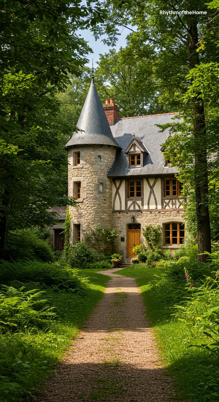 Deep within a verdant summer forest, a gravel path leads to this hidden gem of a French home. The house is a charming blend of architectural styles, featuring a prominent stone turret with a conical roof attached to a classic half-timbered main body. The combination of rough stone, dark timbers, and warm-toned stucco gives it a rustic, storybook quality. Surrounded by a profusion of ferns and lush greenery, the home feels like a secret, peaceful sanctuary, a perfect escape into the cool, quiet embrace of nature.