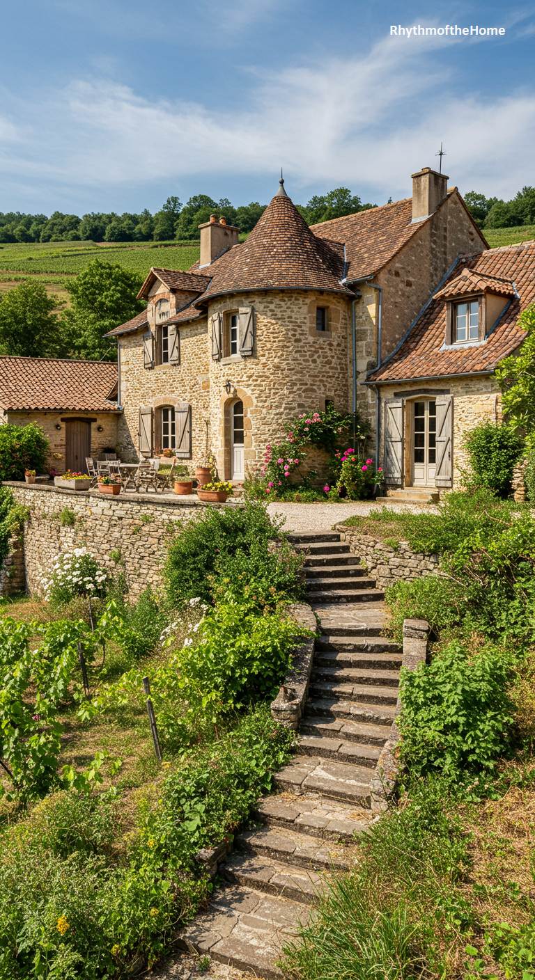 This rustic French home is built into a sun-drenched, terraced hillside, becoming one with its agricultural surroundings. Stone steps descend past rows of young grapevines and lush garden foliage towards the entrance. The house, made of warm local stone with a terracotta tile roof, features a charming round turret and a terrace perfect for enjoying the vineyard views. Climbing roses add a touch of romance to the stone walls. This is a home that is deeply connected to the land and the tradition of winemaking, offering a life lived in tune with the seasons.