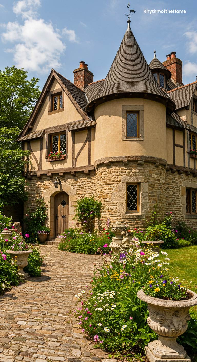 This enchanting French home looks as if it were designed for a fairytale. The architecture is a whimsical mix of rough-hewn stone, warm stucco, and dark half-timbering, all crowned by a charming turret with a shingled, conical roof. A cobblestone path winds through a vibrant cottage garden, overflowing with a colorful mix of wildflowers and daisies in stone planters. The leaded glass windows and simple wooden door add to the historic, handcrafted feel. This is a cozy, magical retreat, a perfect picture of romantic, storybook living.