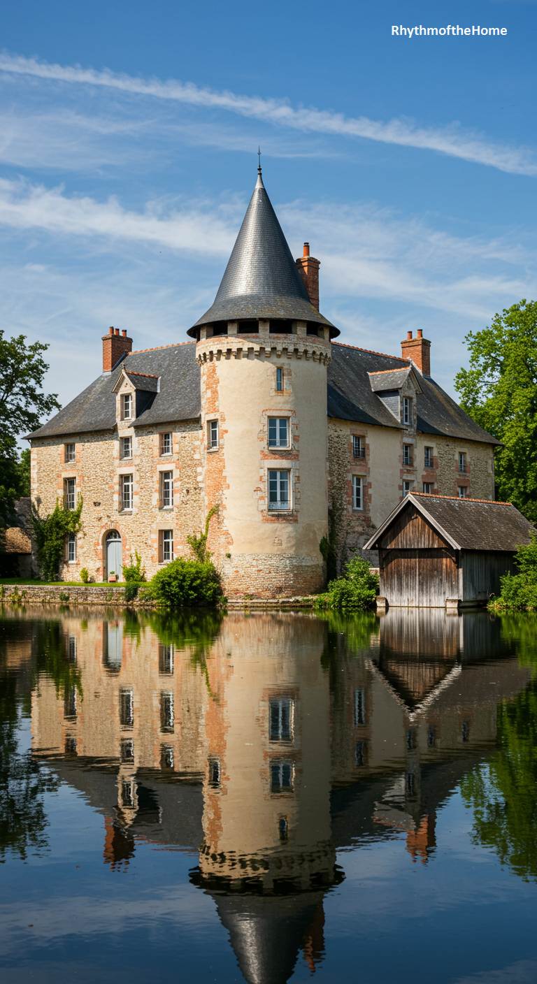 This historic French home, part manor, part castle, is surrounded by the still, reflective waters of a moat, giving it an air of serene isolation. The building’s reflection is captured almost perfectly on the water’s surface, doubling its beauty. The architecture is a blend of sturdy stone and rendered stucco, with a prominent round tower and a steep slate roof. A rustic wooden boathouse sits at the water’s edge, adding to the picturesque quality of the scene. It is a timeless image of peace and history, a private world unto itself.