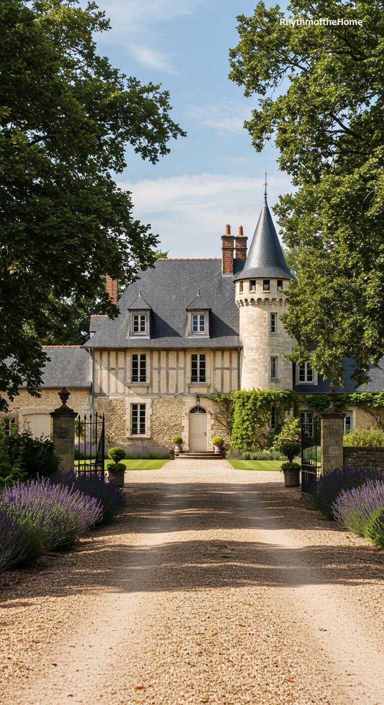The entrance to this elegant French home is a journey through fragrance and color. A long gravel driveway, flanked by beautiful rows of purple lavender, leads through an iron gate towards the house. The building itself is a handsome example of Normandy architecture, with a mix of light-colored stone and half-timbering on the upper floor. A single round turret stands proudly at one end. Framed by leafy green trees, this home offers a grand yet welcoming first impression, blending formal elegance with the rustic charm of the French countryside.