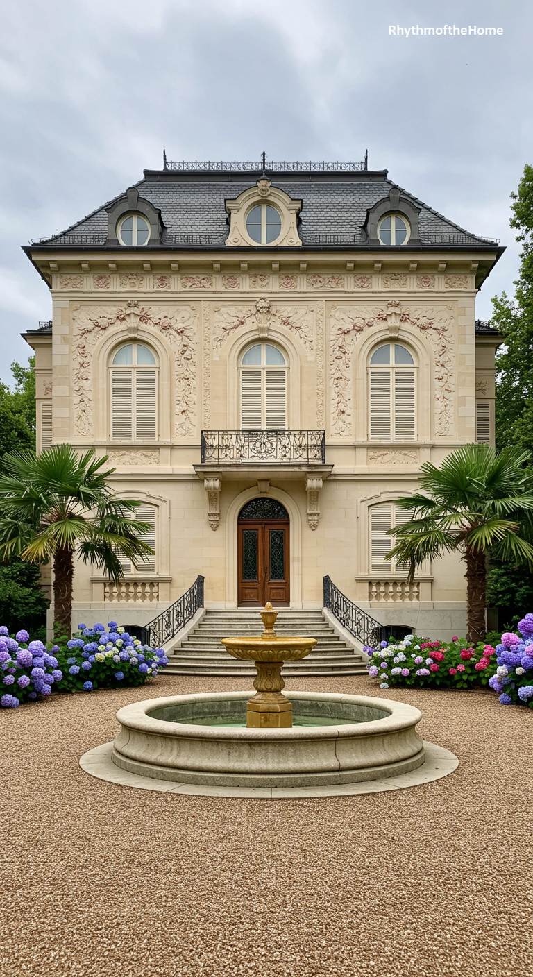 This sophisticated French home showcases the ornate elegance of the Belle Époque era. Its stately, light-stone facade is a canvas of intricate floral and scroll carvings, particularly around the arched windows of the second floor. A central wrought-iron balcony adds a touch of grace, while a dark mansard roof with circular “œil-de-bœuf” windows provides a classic Parisian finish. The formal grandeur is softened by the lush surroundings: two prominent palm trees frame the entrance, and vibrant clusters of blue, pink, and purple hydrangeas bloom profusely, flanking a central stone fountain in the gravel courtyard.