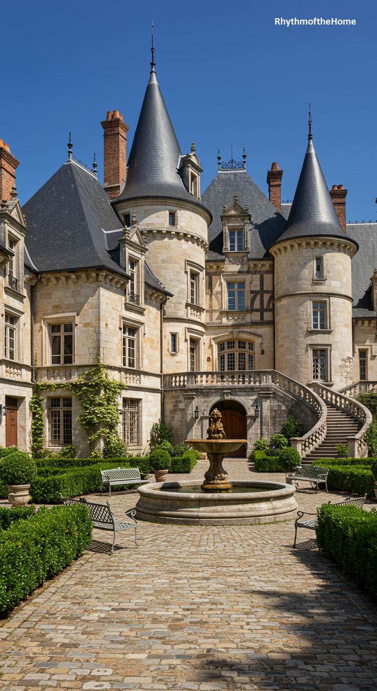 This magnificent French château is arranged around an impressive central courtyard, creating a sense of private, palatial grandeur. A beautiful tiered fountain, flanked by iron benches, serves as the heart of the cobblestone space. The château itself is a work of art, with a stunning combination of multiple turrets, intricate stonework, and a steep slate roof. The architecture feels both powerful and elegant, a perfect blend of medieval strength and Renaissance refinement. It is a breathtaking example of historic French design, preserved in all its glory.