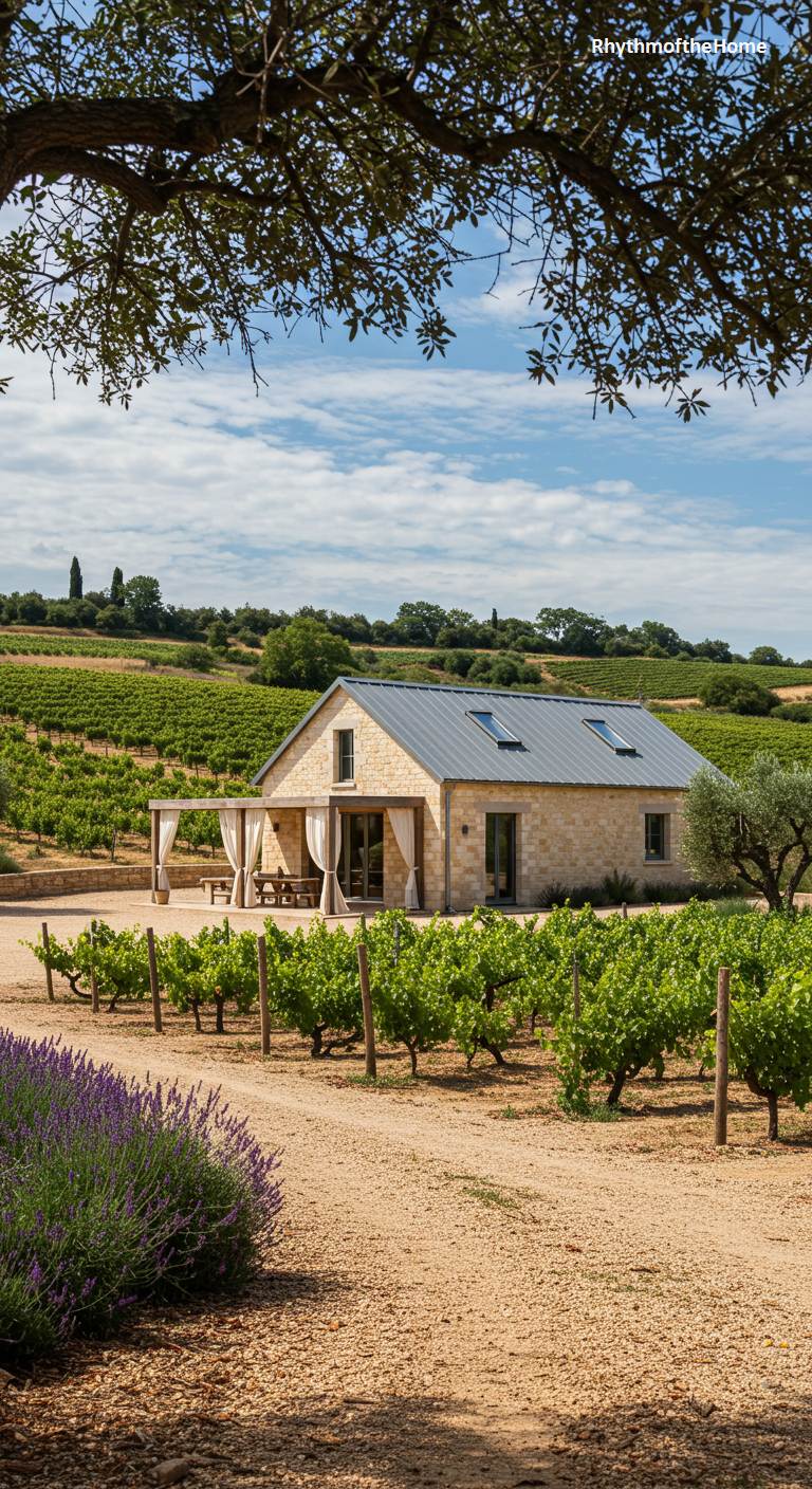 This home offers a fresh, contemporary take on the classic Provençal style. Set amidst a young vineyard, the house is built from traditional light-colored stone but features a modern metal roof and clean lines. A simple pergola with flowing white curtains creates a breezy, shaded outdoor space. The landscape is dotted with lavender and olive trees, classic elements of the region. The overall aesthetic is one of minimalist, rustic elegance, blending the timeless materials of Provence with a modern sensibility for open, light-filled living.