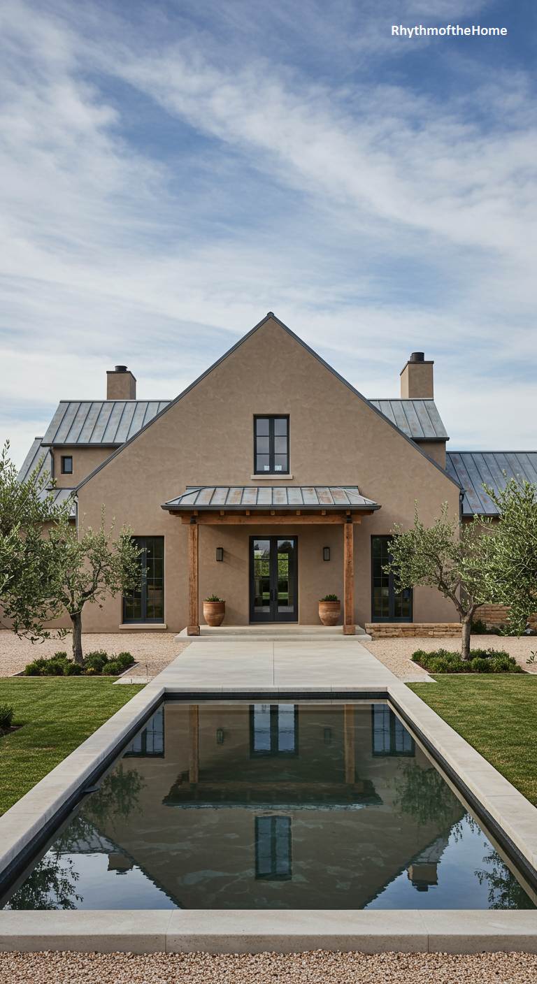 This striking French home reinterprets the farmhouse vernacular with bold, modern simplicity. The building’s gabled form is rendered in a smooth, earthy stucco, with a sleek metal roof. A long, serene reflecting pool leads directly to the front entrance, which is sheltered by a simple timber-framed porch. The symmetry of the pool, the facade, and the two young olive trees creates a sense of calm, minimalist order. It is a sophisticated and tranquil residence that honors its rural setting while embracing a clean, contemporary design language.