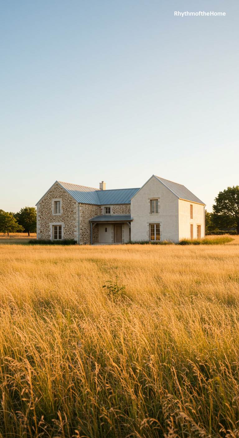 Set against a vast, open field of golden grass, this French home is a study in minimalist beauty. The architecture combines rustic fieldstone with smooth white stucco, creating a compelling textural contrast. The simple, gabled rooflines and cleanly arranged windows speak a modern language, while the materials root the home in its rural, vernacular context. Bathed in the warm, low light of late afternoon, the house has a serene, almost painterly quality, embodying a quiet and thoughtful approach to country living.