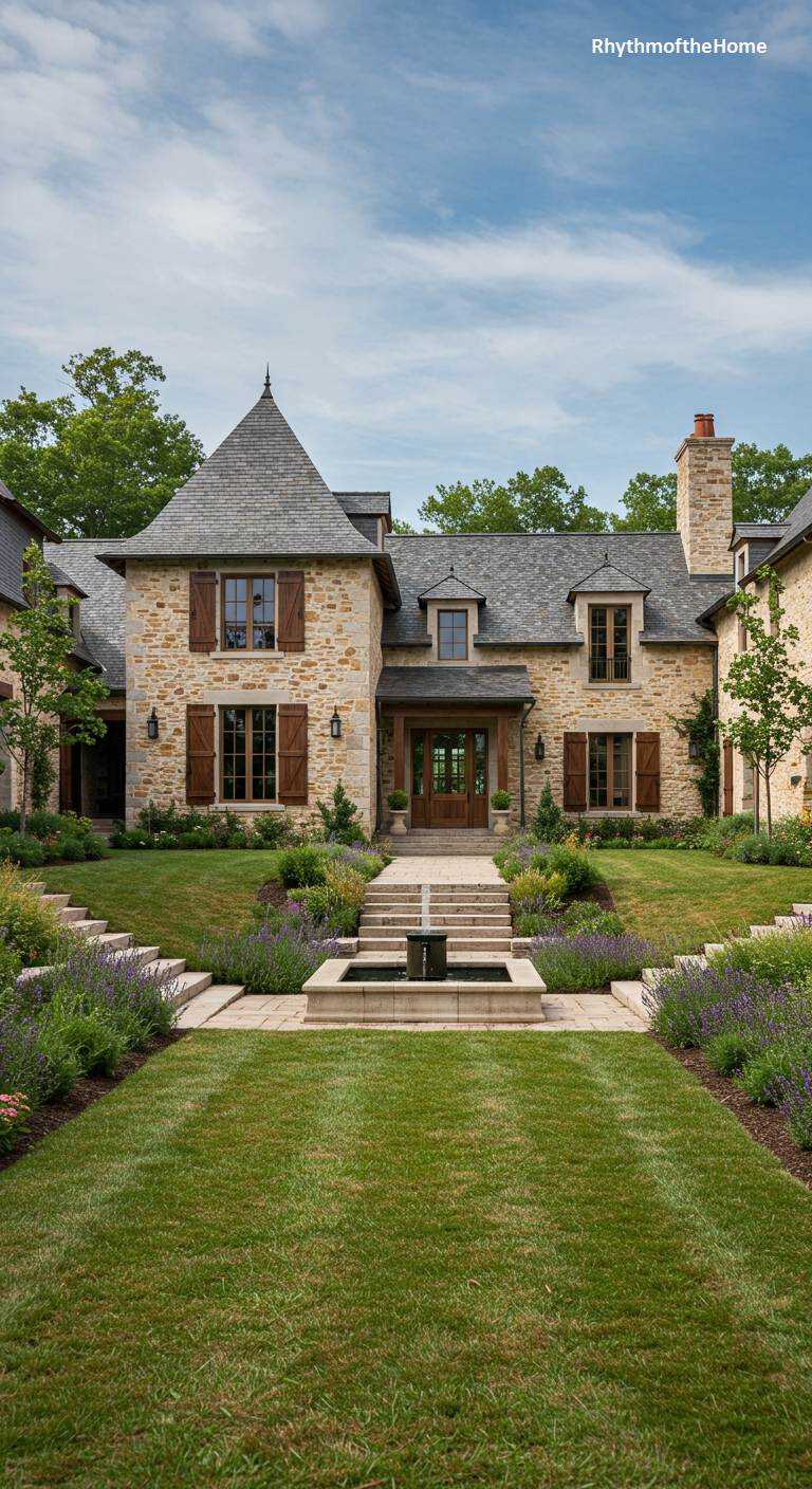 This beautiful French home is a symphony of stone, slate, and garden greenery. A central stone turret serves as the grand entryway, its texture and warmth echoed in the walls of the main house. A tiered water fountain sits at the center of a grassy lawn, creating a focal point for the garden path. The landscaping is lush and romantic, with stepped garden beds filled with lavender and other perennials. The varied rooflines and window styles give the house a custom, evolved-over-time feel, creating a residence that is both stately and welcoming.