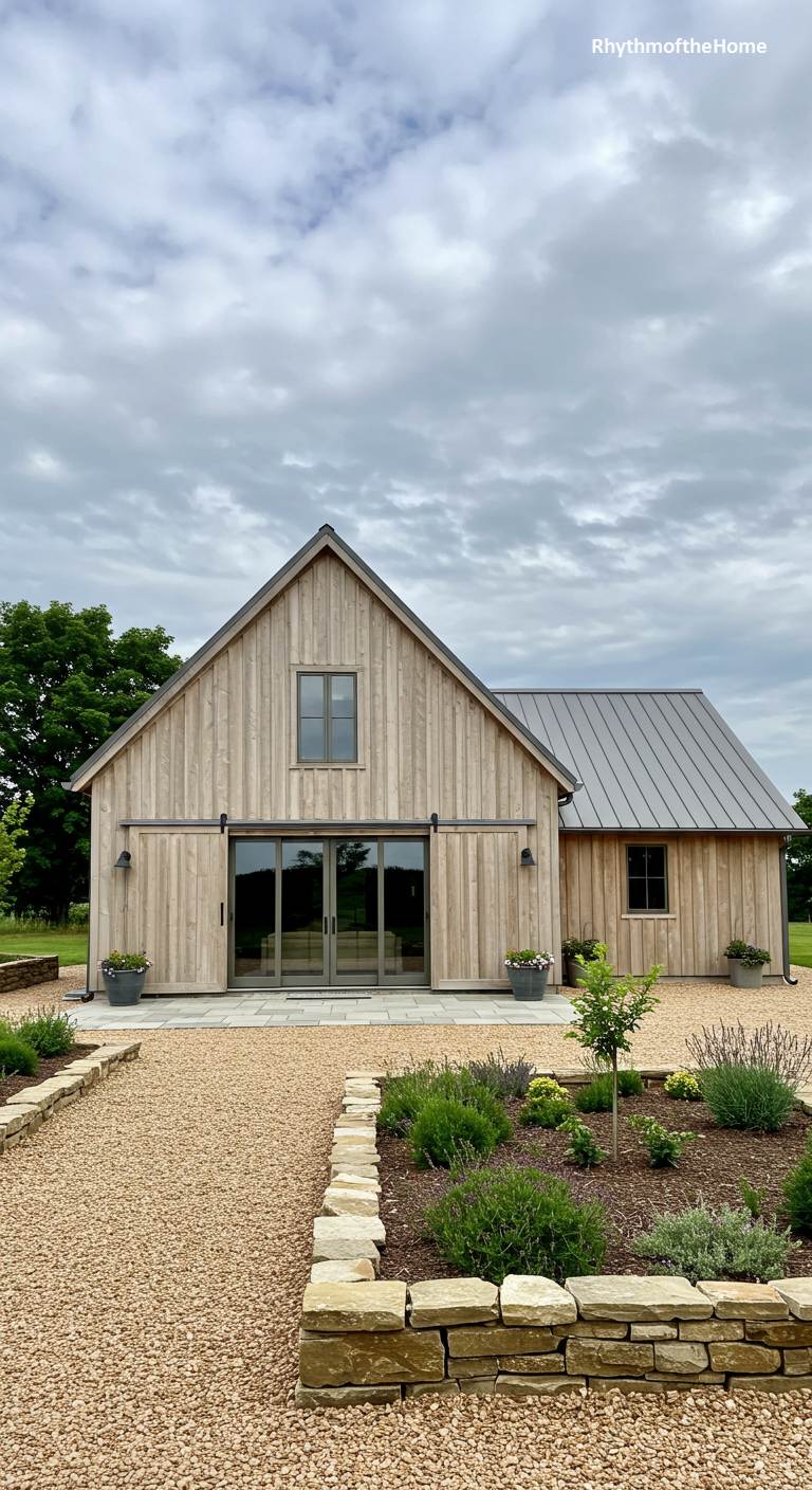 This home is a stunning example of modern rustic design, taking its inspiration from a traditional barn. The exterior is clad in beautiful, light-colored vertical wood siding, which will weather gracefully over time. A dark metal roof provides a crisp, contemporary contrast. Large sliding glass doors open onto a gravel patio area, blurring the line between indoor and outdoor living. The landscaping is simple and naturalistic, with a gravel path winding through beds of drought-tolerant herbs and grasses, perfectly complementing the home’s understated, organic aesthetic.