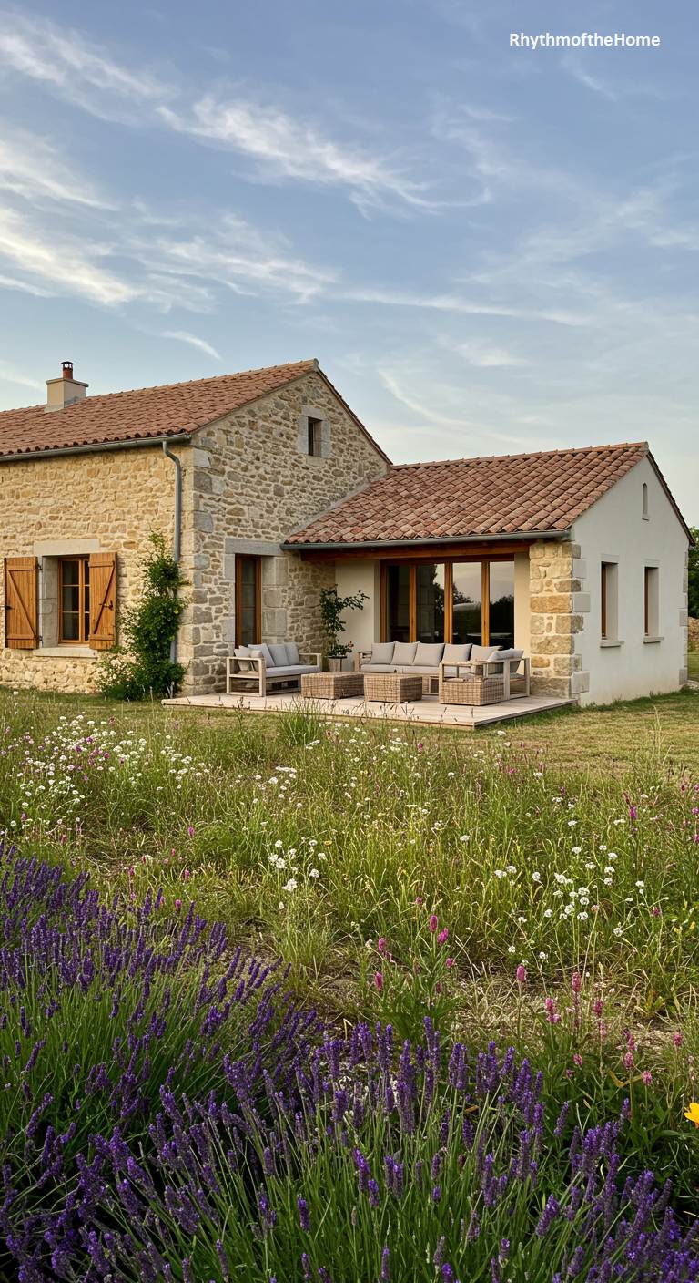 This charming French country home is nestled in a breathtaking wildflower meadow. The foreground is a sea of purple lavender and other colorful blooms, creating a natural, untamed garden. The house itself is a picture of rustic simplicity, with a stone and stucco exterior, a terracotta roof, and a newer extension with large glass windows and doors opening onto a modern patio. It represents a beautiful blend of old and new, a historic farmhouse thoughtfully updated to embrace the stunning natural beauty of its idyllic, flower-filled surroundings.