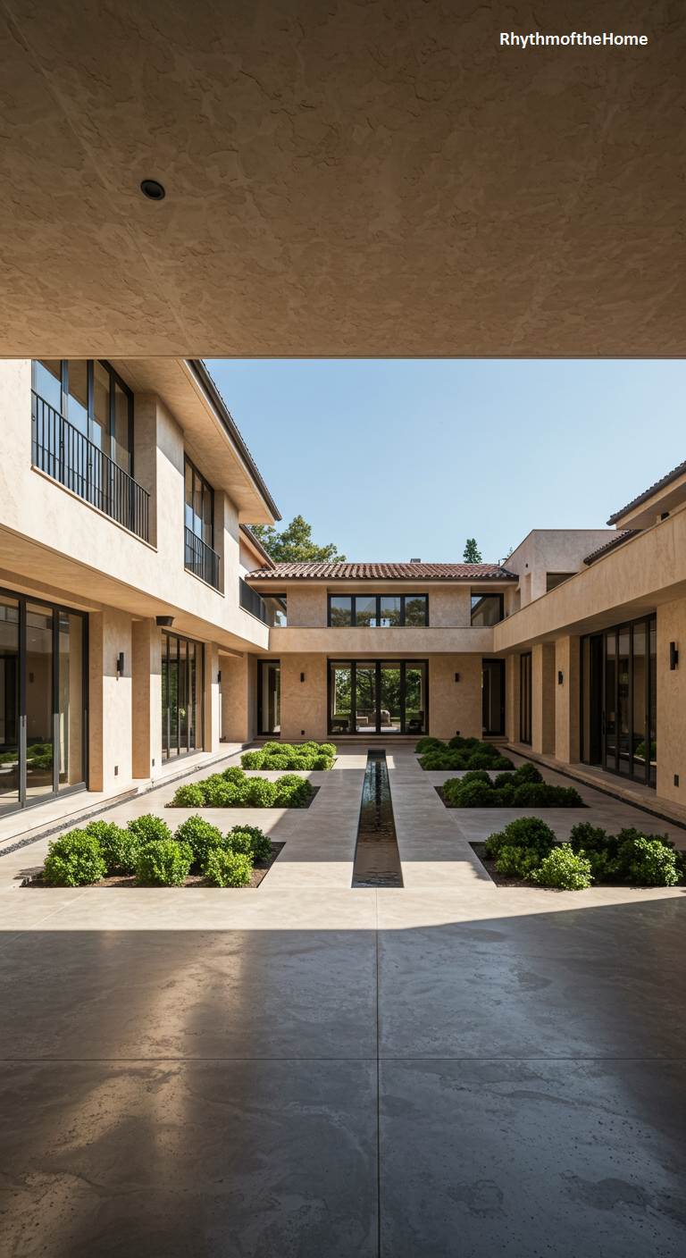 This unique French home embraces a minimalist, almost Zen-like aesthetic in its central courtyard. The building itself is contemporary, with clean lines, large glass windows, and a smooth stucco finish. The courtyard space is a masterpiece of tranquil design: smooth concrete pavers are interspersed with geometric beds of low-lying green shrubs. A narrow water channel runs down the center, adding the gentle element of moving water. The play of light and shadow from the overhanging roof creates a peaceful, contemplative atmosphere in this stunningly modern and serene outdoor room.