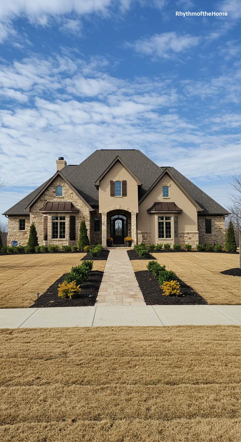This handsome suburban home draws heavily on French architectural inspiration to create a look of established elegance. The facade is a pleasant mix of rustic stone and earthy stucco, with a complex, hipped roofline and classic brown shutters. The arched entryway adds a touch of formal grace. The landscaping is neat and tidy, with a paved walkway leading to the front door, bordered by mulch beds containing small shrubs. The dormant brown lawn suggests a cooler season, but the home’s warm tones and solid construction provide a sense of year-round comfort and curb appeal.
