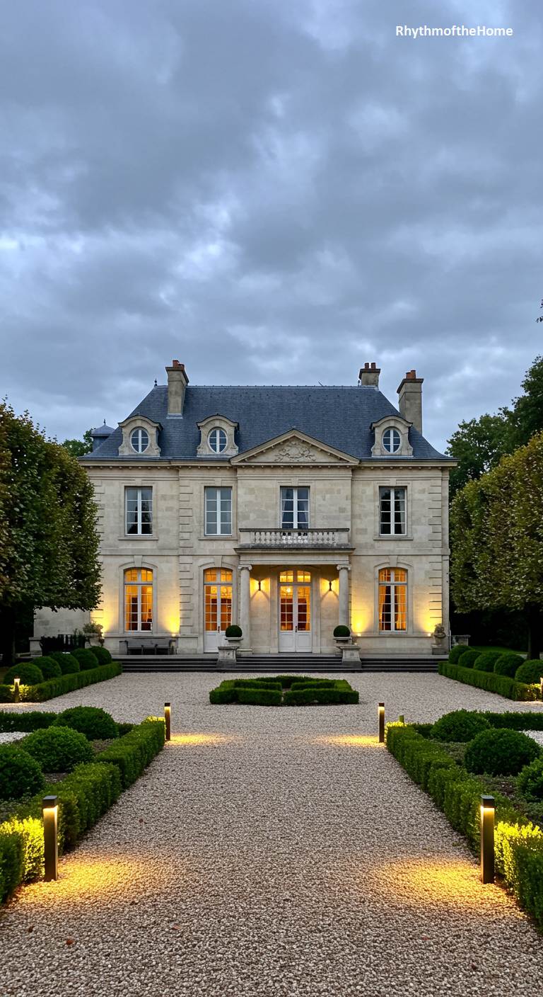 As night falls, this classic French home is beautifully transformed by a sophisticated lighting scheme. The pale stone facade, with its elegant columns and stately balcony, is softly uplit, highlighting its architectural details. The real magic, however, is in the garden, where modern, glowing bollards illuminate the gravel pathways, guiding visitors through the perfectly manicured boxwood hedges. The warm, golden light creates an atmosphere of exclusive, contemporary elegance, casting the timeless, classical design of the home and its formal garden in a dramatic and inviting new light.