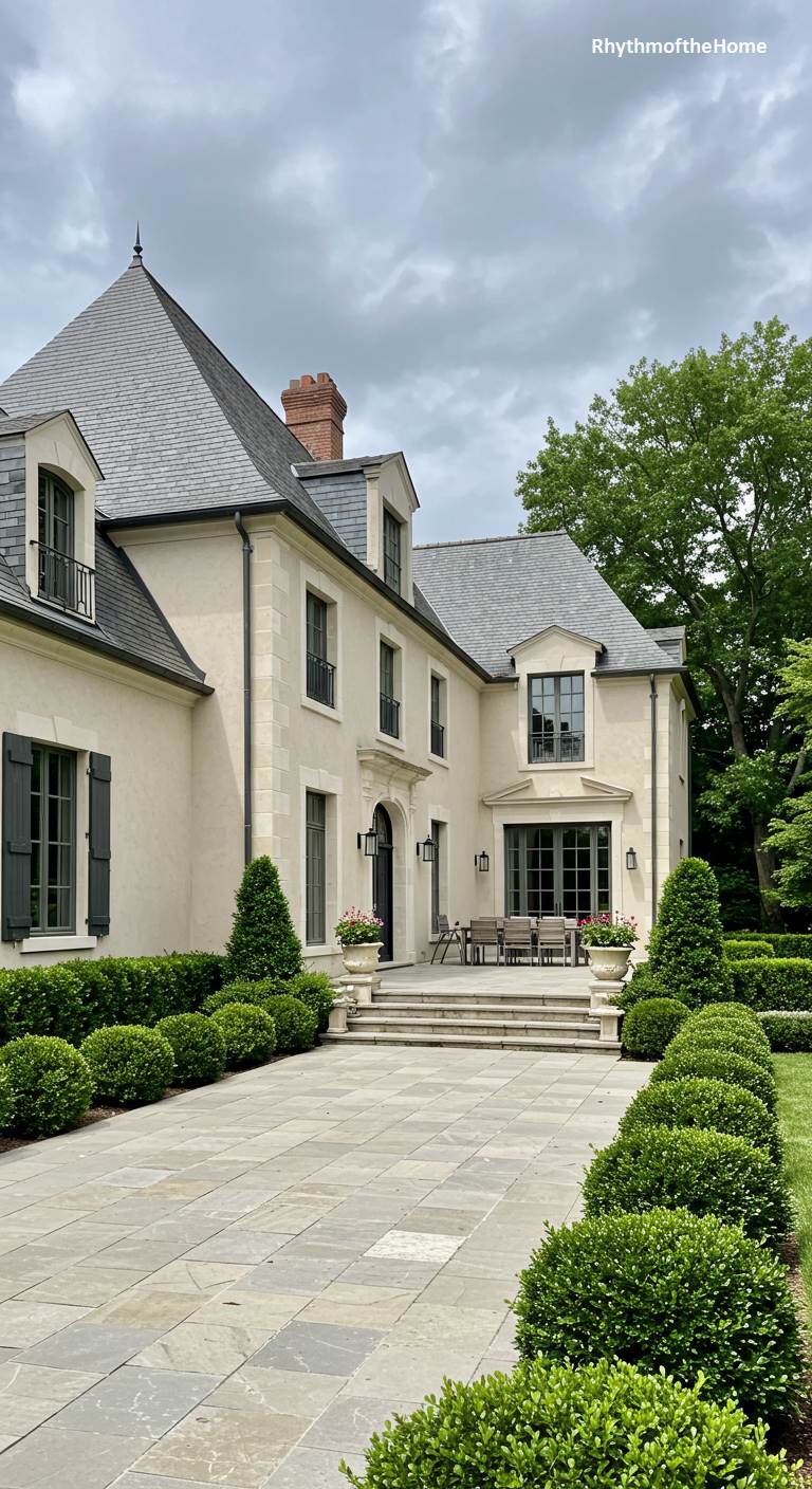 This chic French home expertly merges classic architecture with modern outdoor living. The house itself is a stately composition of pale stucco, dark shutters, and a slate roof, exuding timeless elegance. The traditional gravel courtyard gives way to a spacious, modern patio paved with large, clean-cut stone tiles. This area is furnished for outdoor dining and lounging, effectively extending the home’s living space. The transition is seamless, bordered by perfectly manicured boxwood hedges and conical topiaries, creating a sophisticated environment for both grand entertaining and quiet relaxation.