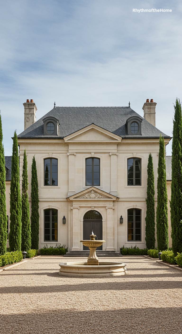 This French home is a masterpiece of Neoclassical symmetry and formal elegance. A central water fountain serves as the focal point of the gravel forecourt, its classic design complementing the house perfectly. The facade is a study in balance, with a central entryway, evenly spaced dark-paned windows, and two chimneys. The entire scene is framed by an avenue of tall, slender Italian cypress trees, which add a dramatic vertical element and a touch of Mediterranean grandeur. It is a picture of refined, harmonious design and impeccable taste.
